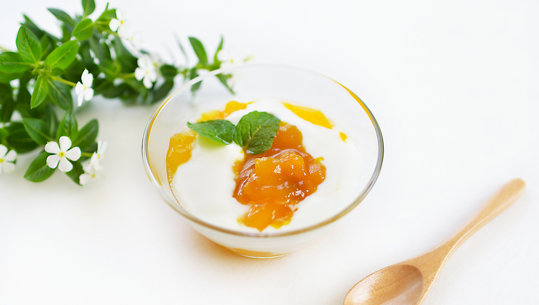 ヨーグルトにマンゴージャムを落とし、爽やかにミントを添えて。